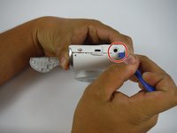 With the screw removed, gently pull up on the silver trim to release one side. It will still be attached to the camera until the next step.
