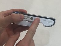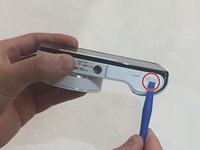 Lift aside the casing for the battery using a plastic opening tool. This compartment is on the bottom of the camera, not under the lens.