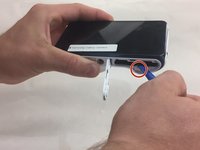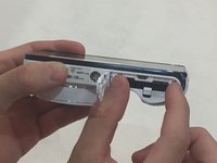 Using plastic opening tool, slide battery capture latch back and allow battery to fall out.