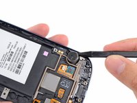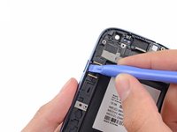 Wedge the flat edge of a plastic opening tool in between the the earpiece/buttons/ambient light sensor ribbon cable and run it down to loosen the adhesive securing the ribbon cable.
