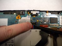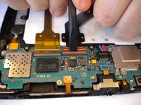 Gently pry up the tab to disconnect the black flexible ribbon cable from the motherboard.