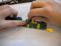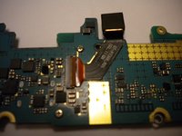 Using flat side of Spudger, lift orange tab connecting the flex ribbon of the camera to the motherboard.
