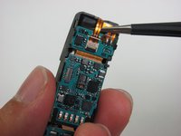 Disconnect the ribbon cables connecting the screen to the motherboard by lifting their metal connectors up off of the board with tweezers.