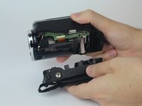 With both hands, pull the side strap apart from the rest of the camcorder.