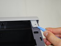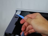 Using a plastic opening tool, gently lift one side of the top panel from its peg.