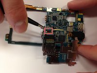 This guide will give instructions on removing the daughterboard from the motherboard in the Samsung Mythic SGH-a897. Tweezers are used to successfully remove the daughterboard from the motherboard by unclipping a connector.
