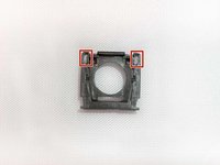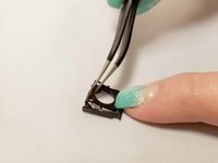 Use angled tweezers to place the assembled retainer onto the two (2) metal brackets on the keyboard.