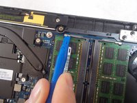 Use a plastic opening tool to nudge one clamp holding one stick of RAM outward. If done correctly the clamp should move away from the stick of RAM. Do this with the clamp on the opposite side of the same stick or RAM. The stick of RAM will pop up when both clamps are released