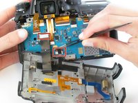Use your fingers to remove the metal piece with the blue ribbon cable and the rubber buttons lying underneath.