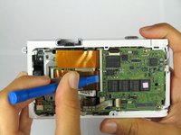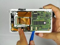 • Do not completely separate the back panel from the camera. There is a ribbon on bottom left back corner underneath the buttons. The ribbon will hold the back panel to the camera. Do not jam the tool in this part or the ribbon will rip.