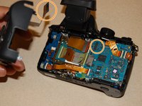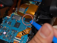 Then use the plastic opening tool to dislodge the Ribbon Cable, located near the top of the camera, from the Circuit Board.