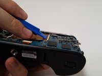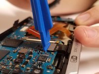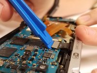 Lift the black latch of the left main ribbon connector using a wide-set plastic opening tool in a downward motion.