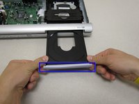 • Press down on the disc tray with your thumbs while also pressing up with your pointer finger on the left and right edges of the silver cover. The cover should easily pop up and off the disc tray.