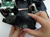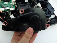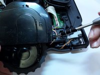 Remove the screw securing the black plastic piece to the right of the wheel casing.