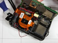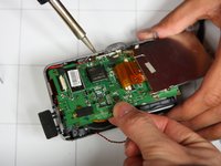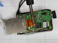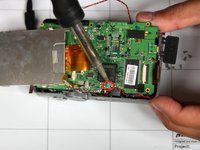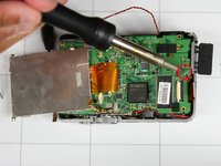 Using soldering iron, melt away solder and warm up metal located at top of circuit board as shown in picture