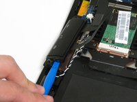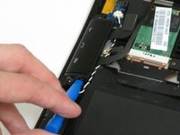 Find an opening on the back of the laptop. Use the plastic prying tool to help pry open the back panel of the laptop.