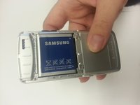 Gently insert a pair of tweezers under the Samsung logo on the bottom of the phone. Then unscrew the two .4 cm Phillips head screws underneath.
