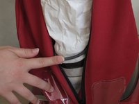 Identify the white bag liner in the red bag.
