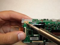 Touch the hot tip of the solding iron to the first solder connecting the flash mechanism to the logic board until the solder melts.