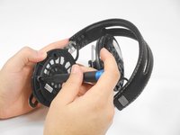 Pull the earmuff near the top until the seam starts to pull from the split in the headphone case. Continue until the earmuff fully separates from the headphones as shown.