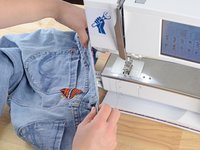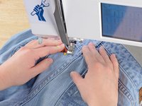 Slide the jeans into the sewing machine, positioning the needle over the edge of the patch.