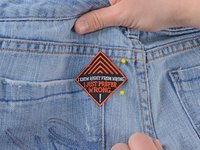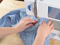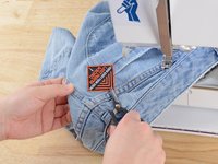 Patch jeans with a sew-on patch. This technique is also applicable for adding patches to bags, bandanas, and boy-scout uniforms. Patches can also be sewn on by hand.