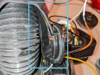 • There is a screw (red) holding the cable channel cover in place, remove this to carefully extract the cable channel (blue). This will make replacing the wires much easier! I only found out after carefully pulling the new wires thru soldered to the old...