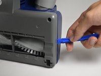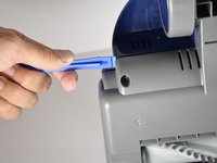 Insert the plastic opening tool into the crevice between the blue and the dark grey plastic frames enclosing the roller brush.