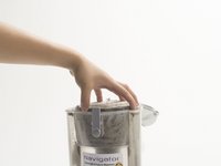 Pull back simultaneous on the plastic handle and remove the dust container.