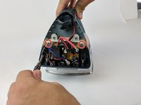 Use the Philips head #0 screwdriver to remove the two 11.77mm screws holding the white clamp to the iron.