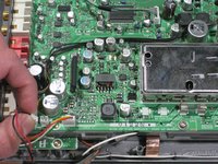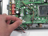 Remove the two speaker cables and the connector from the circuit board by pinching the plastic connectors and firmly pulling up.