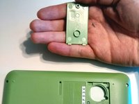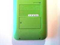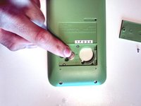 Fit battery door into the two calculator housing slots. Once placed, the battery door should lay flush with the surrounding green housing.