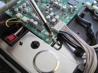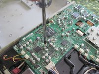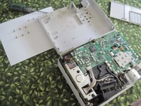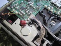 There are two more screws to remove, the two chrome-plated phillips screws in the back-panel near the input sockets. There is another screw like these near the black power socket--it is not necessary to remove that one. Keep these two screws separate from the six longer ones you just removed in the previous step.