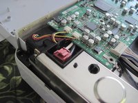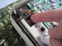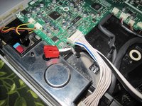 The part we are replacing, the thermal fuse, is a silver button with one black and one white wire connected to it. Both of these plug into the chassis at this red connector. Remove the clear plastic cover with a flat screwdriver.