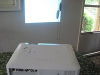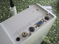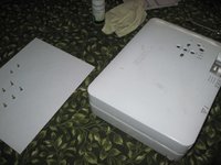 Now you can plug it in. The little indicator lights should light up. If they light up green, steady or blinking, one or two, just let it be. The lamp will eventually come on, and the fan too. Press the "off" button to shut-down as usual after the lamp comes on. If a red "power" indicator comes on, that's fine too. You can press the "on" button.