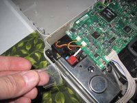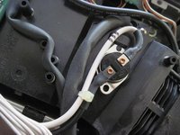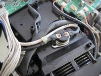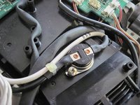 The business-end of the thermal fuse goes back on the black fan housing. One ear slips under a black plastic clip. The other ear is screwed down with the screw you removed back in step 9.