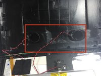 The speakers are located on the inside of the back casing. They are two small black ovals thats are connected with two sets of black and red wires and connect to the logic board.