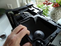 Pull the bean hopper back about 1 cm, then lift it off at an angle towards the back. Make sure that the axle of the grinder adjuster comes off. The container is still connected to the powder compartment lid cable. You don't need to detach it, just put the whole thing on top of the machine.