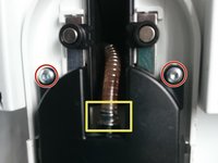 Der verschiebliche Kaffeeauslauf ist von einem Gehäuse umschlossen. Setze ein Öffnungswerkzeug seitlich in den Spalt ein, der beide Gehäusehälften trennt.