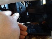 Drücke mit dem Flachschraubendreher in die Öffnung auf der Seite mit der Brühgruppe. Dadurch wird die letzte Raste der Oberseite gelöst.
