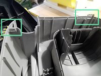 Die grün markierten Klippse rasten bei der Montage wieder ein. Die 3 Torx müssen wieder eingeschraubt werden.