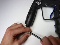 Sometimes the Ion leaks air from the macro line after heavy use. The macro line wiggles loose causing the macro line fittings to vent air. While working on the Ion, the user should be aware of the pressure due to air inside the gun. Pressurized air can be forceful, causing particles to be ejected from the gun into your eyes and/or skin. When air bubbles enter the bloodstream, they can block blood vessels and cause embolisms. To avoid this, make sure to point the gun in a safe direction when de-gasing the Ion.