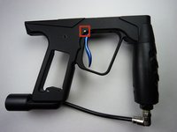 Remove the 1-1/4" screw that's attached to the blue tube above the front grip using a 3/32" Allen Wrench.