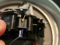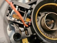 We need to disconnect the external switch mechanism from the temp sensor assembly. They are connected with a hinge (clear plastic to black plastic) in 4 points.(blue squares on image)
