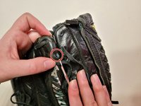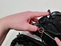 Going around the back of the ring finger, insert the string through the top hole on the left side of the ring finger.