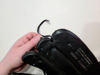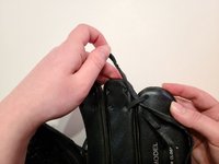 On the backside, push the string through the bottom left hole on the middle finger and pull the string all the way through.