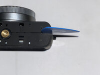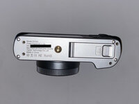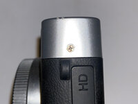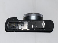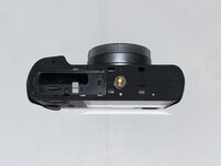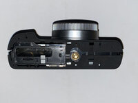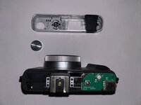 Inside the top cover, I found that the viewfinder and the ring around the power button were screwed in from the underside.
