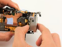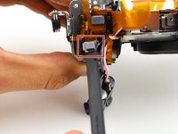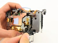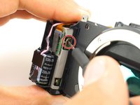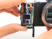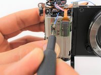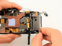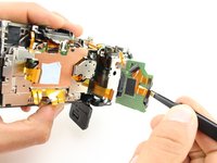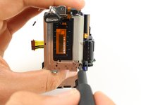 Unplug the small ribbon located underneath the ON/OFF button and detach the button assembly from the camera.