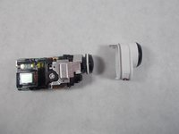 Now remove the screw directly above the LCD display, the thin rectangle near the rear of the lens unit. This will loosen the black plastic casing over the internal circuitry.