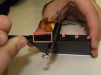 The arrow pointing to the black area indicates another sticker. This sticker will need to be removed in order to thread the ribbon cable through the back cover. This cable is attached to the LCD panel.